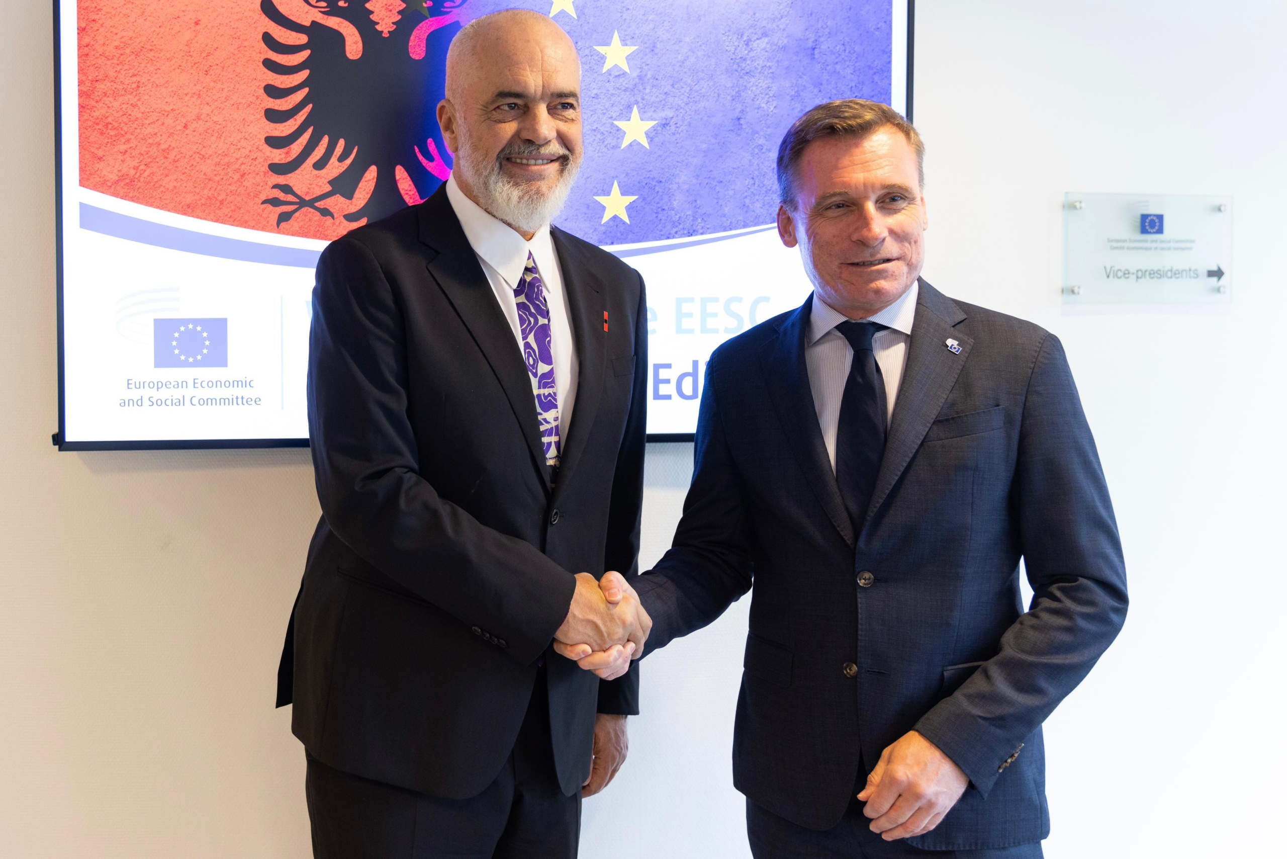 Kryeministri Edi Rama ndodhet sot në një vizitë zyrtare ne Bruksel, ku në nisje të agjendës zhvilloi një takim me  Presidentin e Komitetit Ekonomik dhe Social Europian Oliver Röpke, në përfundim të të cilit dhanë një konferencë të përbashkët për shtyp: