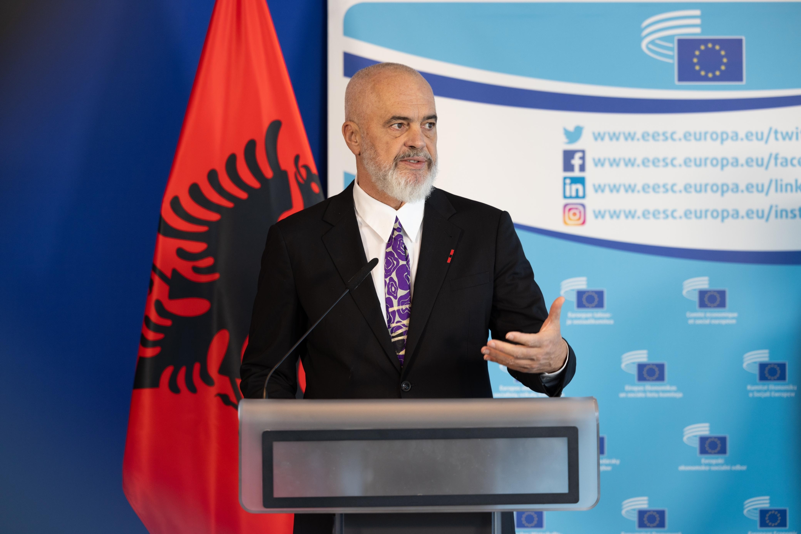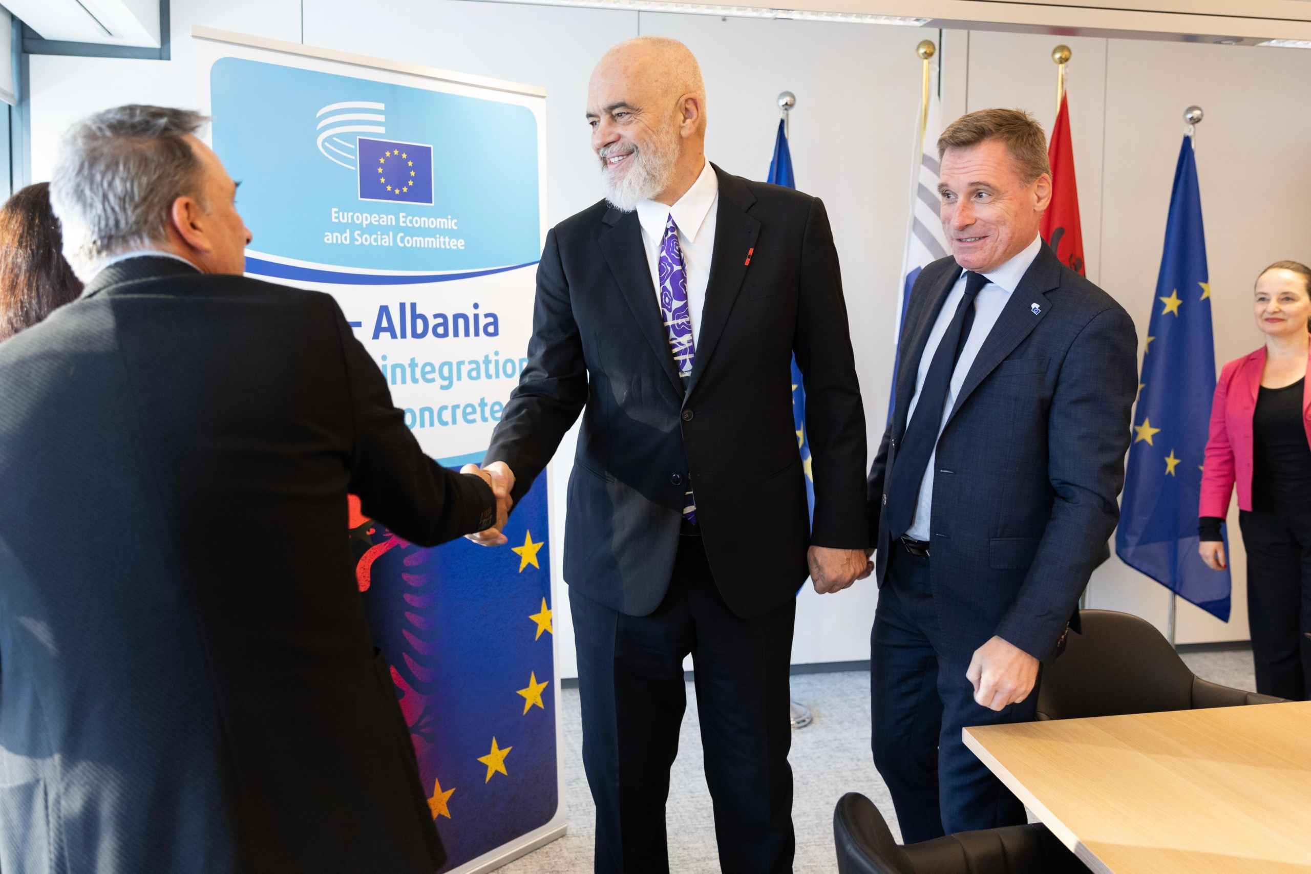 Presidenti i Komitetit Ekonomik dhe Social Europian Oliver Röpke: Të nderuar zonja dhe zotërinj, i dashur kryeministër Rama. Së pari jam vërtetë shumë mirënjohës për vizitën tuaj sot këtu. Kjo dhe sepse dita e sotme është shumë e rëndësishme dhe për Komitetin tonë dhe është dhe një ditë e rëndësishme për  anëtarësimin e Shqipërisë në BE, por edhe për Ballkanin Perëndimor në përgjithësi.